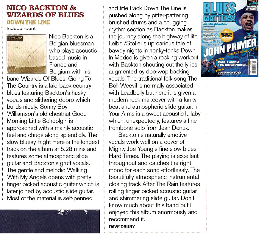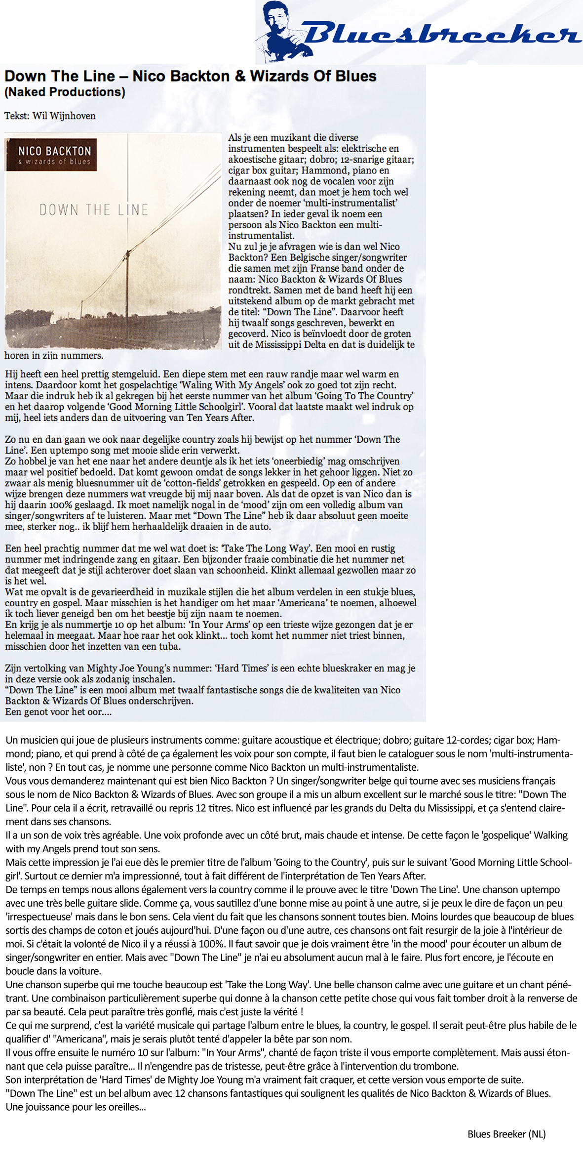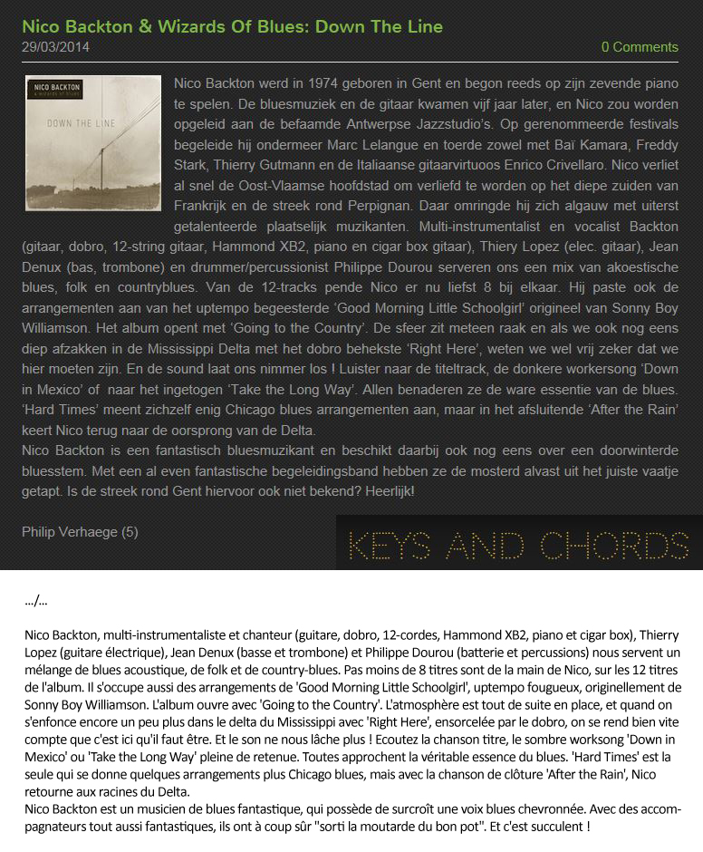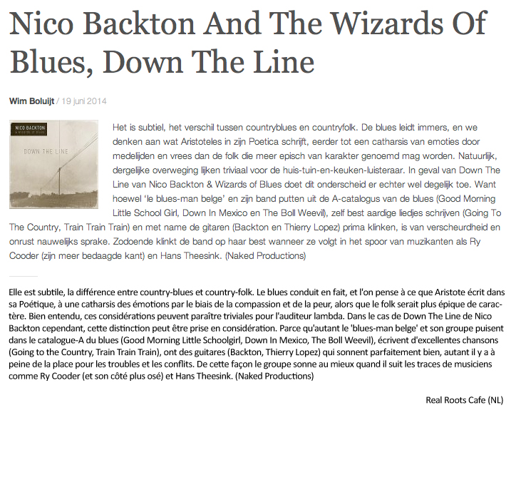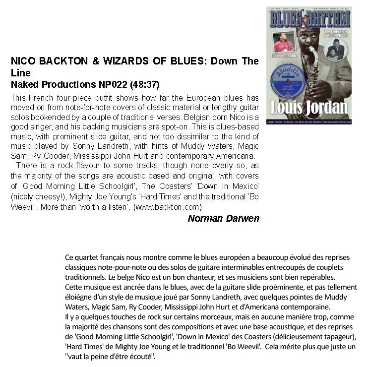 * - "Down The Line" is een mooi album met twaalf fantastische songs die de kwaliteiten van Nico Backton & Wizards of Blues onderschrijven. Een genot voor het oor... "DTL" est un bel album avec 12 chansons fantastiques qui soulignent les qualités de Nico Backton & Wizards of Blues. Une jouissance pour les oreilles... Wil Wijnhoven, Bluesbreeker.nl (NL), 2014 Alles lezen... * - Neuf compos. Elles ont, elles aussi, la patine des grands airs du répertoire, mis à jour par des musiciens dans les mêmes dispositions que le Belge : très bons, sobres et pertinents. Christian Casoni, Blues Again (F), 2014 Lire la suite... * - Zijn stem, we kunnen het niet genoeg herhalen, is dermate geschikt voor de songs die hij laat horen dat hij heel de plaat door je moeiteloos bij de les houdt. Sa voix, nous ne le répéterons jamais assez, est à ce point adaptée aux chansons qu'il fait entendre qu'il accroche sans peine toute notre attention du début à la fin de l'album. Luc Meert, Rootstime.be (B), 2014 Alles lezen... * - Nico Backton a dressé le service de luxe sur la table du festin blues. Du travail d’esthète. François Becquart, Music in Belgium (B), 2014 Lire la suite... * - This French four-piece outfit shows how far the European blues has moved on... Ce quartet français nous montre comme le blues européen a beaucoup évolué... Norman Darwen, Blues & Rhythm Magazine (UK), 2014 Read all... Lire la suite *