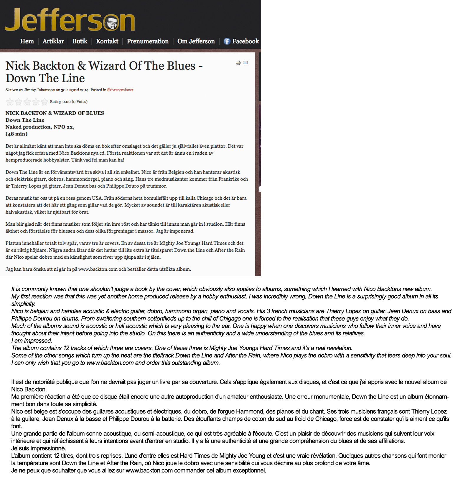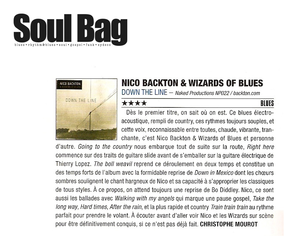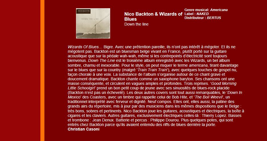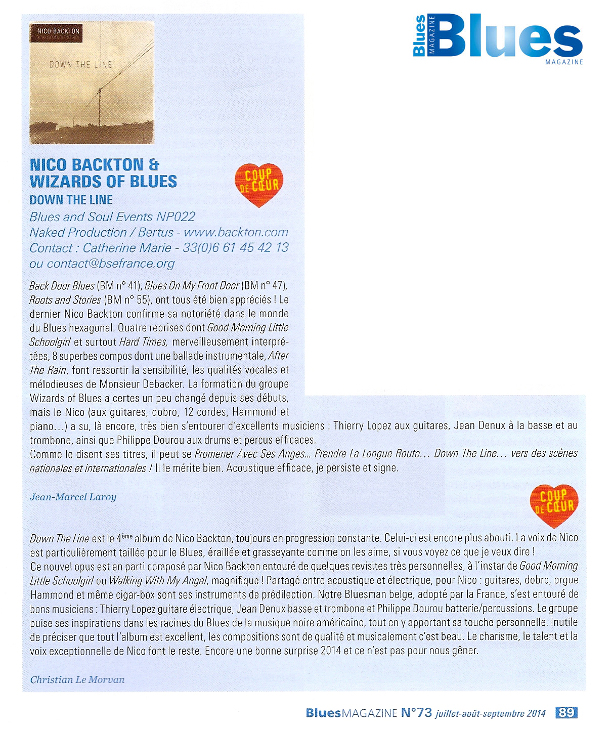 * - "Down The Line" is een mooi album met twaalf fantastische songs die de kwaliteiten van Nico Backton & Wizards of Blues onderschrijven. Een genot voor het oor... "DTL" est un bel album avec 12 chansons fantastiques qui soulignent les qualités de Nico Backton & Wizards of Blues. Une jouissance pour les oreilles... Wil Wijnhoven, Bluesbreeker.nl (NL), 2014 Alles lezen... * - Neuf compos. Elles ont, elles aussi, la patine des grands airs du répertoire, mis à jour par des musiciens dans les mêmes dispositions que le Belge : très bons, sobres et pertinents. Christian Casoni, Blues Again (F), 2014 Lire la suite... * - Zijn stem, we kunnen het niet genoeg herhalen, is dermate geschikt voor de songs die hij laat horen dat hij heel de plaat door je moeiteloos bij de les houdt. Sa voix, nous ne le répéterons jamais assez, est à ce point adaptée aux chansons qu'il fait entendre qu'il accroche sans peine toute notre attention du début à la fin de l'album. Luc Meert, Rootstime.be (B), 2014 Alles lezen... * - Nico Backton a dressé le service de luxe sur la table du festin blues. Du travail d’esthète. François Becquart, Music in Belgium (B), 2014 Lire la suite... * - This French four-piece outfit shows how far the European blues has moved on... Ce quartet français nous montre comme le blues européen a beaucoup évolué... Norman Darwen, Blues & Rhythm Magazine (UK), 2014 Read all... Lire la suite *