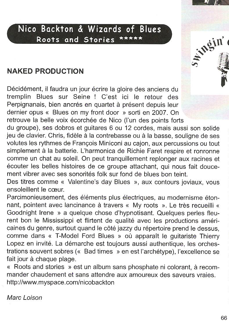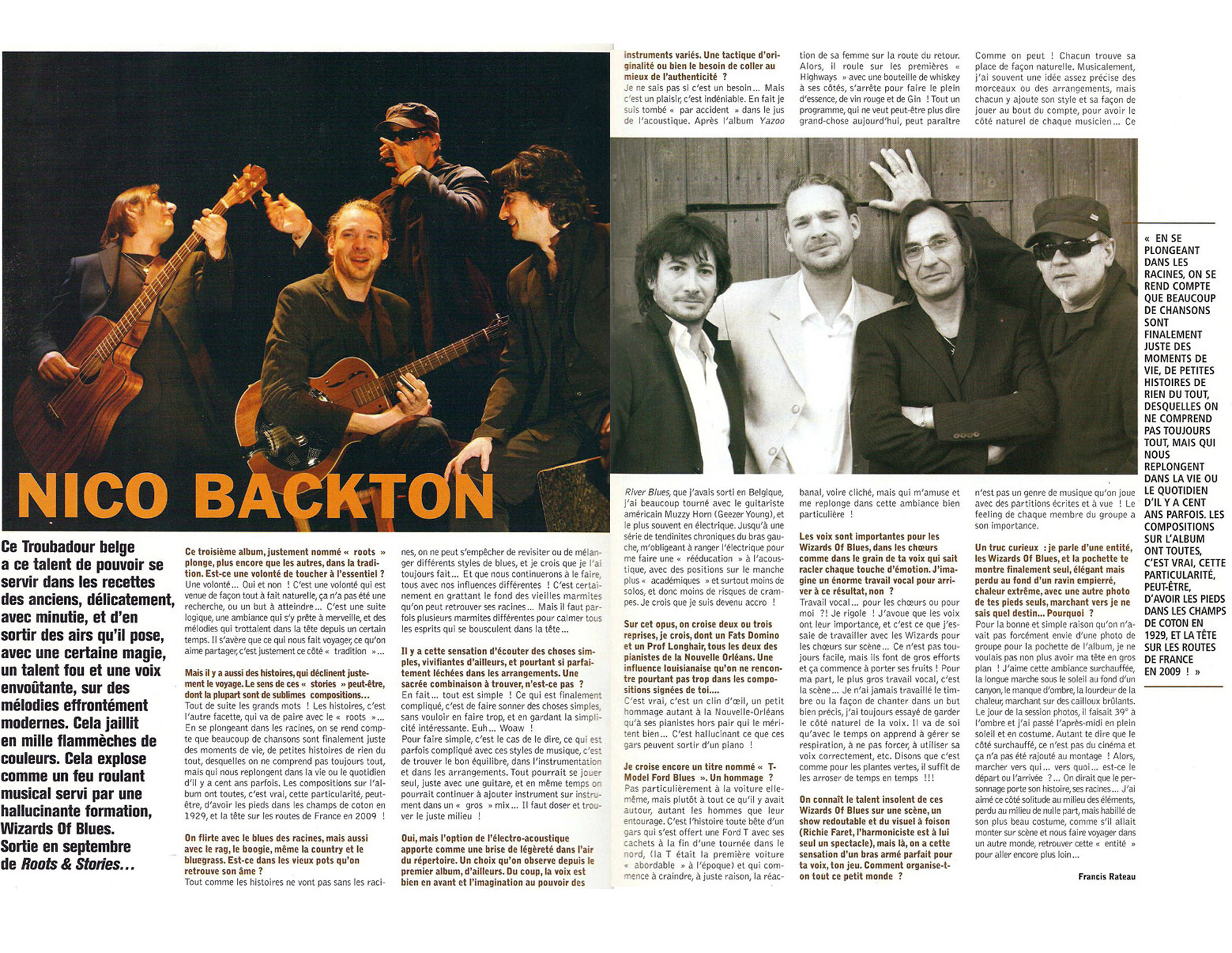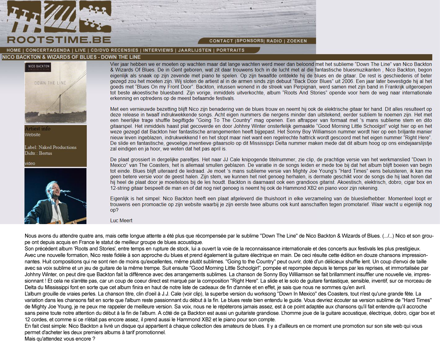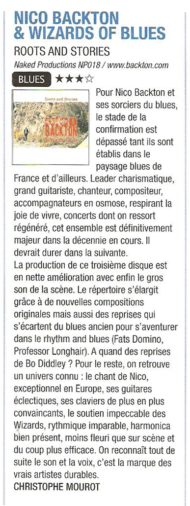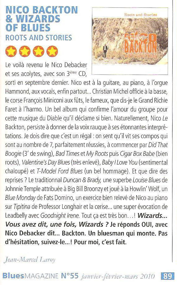 - Leader charismatique, grand guitariste, chanteur, compositeur, accompagnateurs en osmose, respirant la joie de vivre, concerts dont on ressort régénéré, cet ensemble est définitivement majeur dans la décennie en cours. Christophe Mourot, Soulbag Magazine (F) Lire la suite... * - Het kan haast niet anders zijn dan dat "Roots and Stories" buiten Frankrijk en België ook de rest van Europa op de knieën krijgt... Bluesbreeker.nl (NL) Alles lezen... * - Un bel album qui confirme l'amour du groupe pour cette musique du Diable qu'il déclame si bien. Naturellement, Nico 'Le' Backton,persiste à donner de la voix rauque à ses étonnantes interprétations. Je dois dire que c'est un régal... Jean-Marcel Laroy, BluesMAGAZINE Lire la suite... * - Quelques perles fleurent bon le Mississippi et flirtent de qualité avec les productions américaines du genre... La démarche est toujours aussi authentique, les orchestrations souvent sobres, l'excellence se fait jour à chaque plage... Marc Loison, Blues 'n' Co Lire la suite... * - Op deze cd hebben Nico Backton & The Wizards of Blues het bewijs geleverd: het zijn tovenaars van de ouderwetse vooroorlogs klinkende akoestische blues! Een album dat echt meer dan de moeite waard is om te beluisteren. Eigenlijk is het gewoon een must have ! Bluesforum.nl Alles lezen... * - Depuis le temps que le genre a été défriché et que toutes les subtilités en sont connues, ceux qui parviennent encore à étonner dans ce registre le font par l'originalité de l'interprétation ou l'authenticité de leur état d'esprit. Nico Backton est un des ces véritables ménestrels du 12-mesures, un voyageur qui a trempé ses bottes dans la poussière du Sud des Etats-Unis et qui a forgé son âme au contact des bluesmen originaux. François Becquart, Music in Belgium Lire la suite... * - Nico Backton is een fantastisch muzikant en beschikt daarbij ook nog eens over een doorwinterde bluesstem, met een al even fantastische begeleidingsband hebben ze de mosterd alvast uit het juiste vaatje getapt. Is Gent hiervoor ook niet bekend? Heerlijk ! Philip Verhaege, Keys and Chords Alles lezen... * - Cela jaillit en mille flammèches de couleurs. Cela explose comme un feu roulant musical servi par une hallucinante formation, Wizards of Blues. Sortie en septembre de "ROOTS AND STORIES"... Françis Rateau, Xroads Magazine Lire la suite...