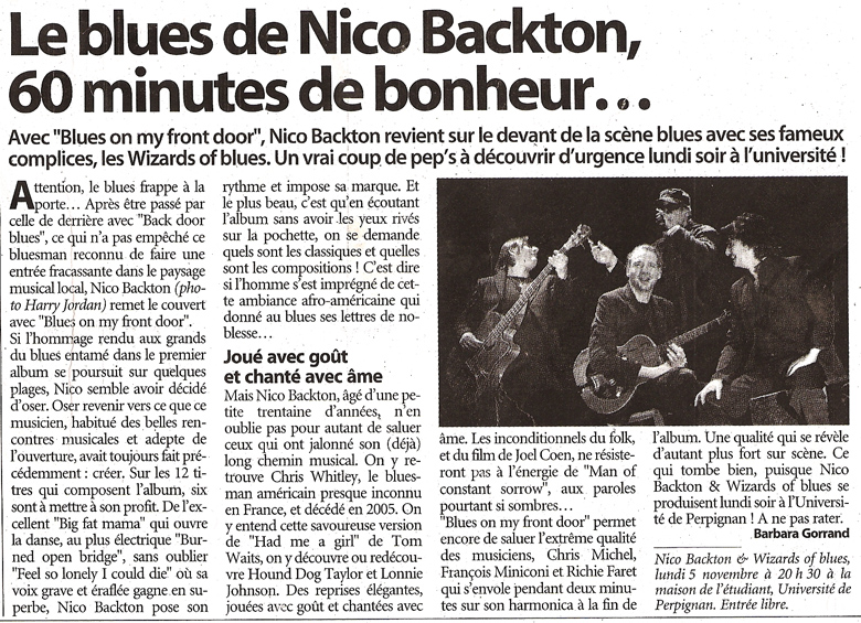 * - Hij heeft niet alleen goed geluisterd, maar ook deze muziek zich eigen gemaakt. Zeer verdienstelijk zelfs. Zijn spel is compleet. Geen standaardriedeltjes, wel die van een talent met een uitstekende vaardigheid op gitaar en dobro. Willem Croese, Blues uit de polder.nl Alles lezen... * - Au REX, Nico Backton et son Wizards of Blues, venant de Perpignan, ont confirmé leur statut de meilleur groupe français en Blues acoustique... Journal Ouest France Lire la suite... * - ... Sa voix grave et éraflée gagne en superbe, Nico Backton pose son rythme et impose sa marque... L'Indépendant Lire la suite...