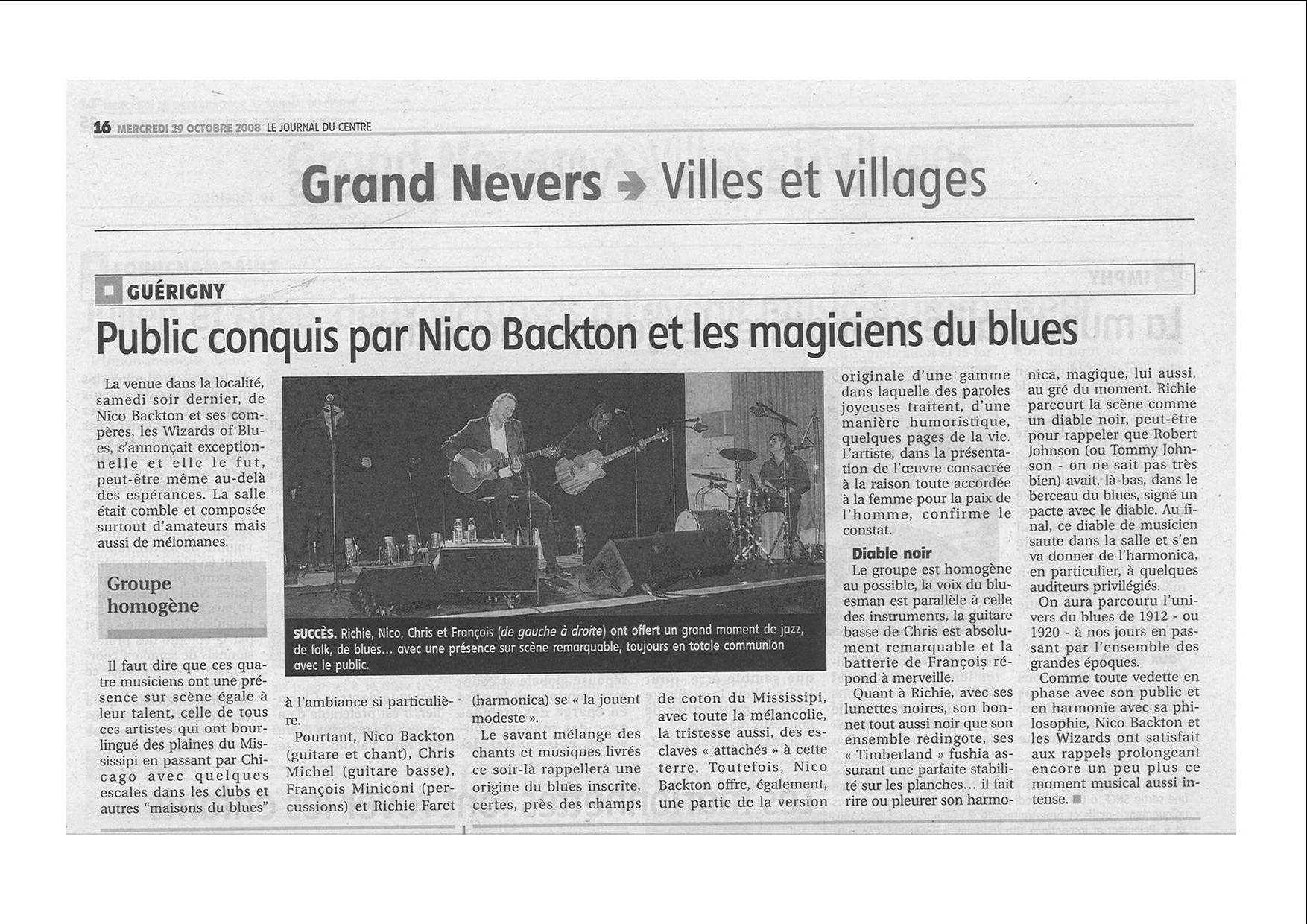 * - La venue de Nico Backton et ses compères, les Wizards of Blues, s'annonçait exceptionnelle et elle le fut, peut-être même au dela des espérances. Le Journal du Centre Lire la suite...
