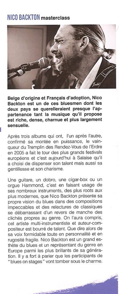 Salaise Blues Festival (F), 2016 Lire la suite... * - Nico Backton rappelle à ceux qui l’auraient oublié qu’il est un des bluesmen européens parmi les plus brillants de sa génération ! Nico Backton reminds those who'd had forgotten the he is one of the most brilliant bluesmen of his generation ! Fred Delforge, Zicazic (F), 2014 Lire la suite... * - A écouter avant d'aller voir Nico et les Wizards sur scène pour être définitivement conquis, si ce n'est pas déjà fait ! To listen to before going to see Nico and the Wizards live to be convinced for good, if it's not done yet ! Christophe Mourot, Soul Bag (F), 2014 Lire la suite... * - Nico Backton is een fantastisch bluesmuzikant en beschikt daarbij ook nog eens over een doorwinterde bluesstem. Nico Backton est un musicien de blues fantastique, qui possède de surcroît une voix blues chevronnée. Philip Verhaege, Keys and Chords (B), 2014 Alles lezen...